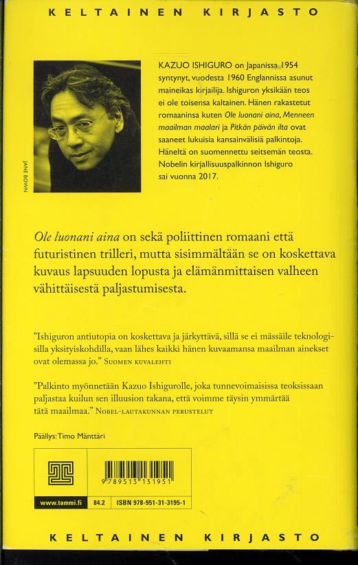 Kirjan nimi: Ole luonani aina Tekijä: Kazuo Ishiguro ISBN: 9789513131951 Kustantaja: Tammi Painovuosi: 2005 Painos: Ei mainintaa Sivumäärä: 394 Sidonta: Sidottu kansipaperein Tuote on käytetty.