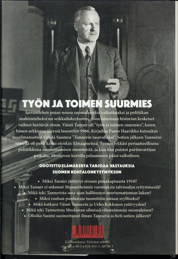 TYÖN JA TOIMEN SUURMIES Jarrumiehen pojan nousu suomalaiseksi vaikuttajaksi ja politiikan mahtimieheksi on seikkailukertomus, jossa isänmaan historian keskeiset vaiheet heräävät eloon. Väinö Tanner oli "työn ja toimen suurmies", kuten hänen arkkunsa ääressä lausuttiin 1966. Kirjailija Paavo Haavikko kutsuikin maailmansotien välistä Suomea "Tannerin tasavallaksi". Sotien jälkeen Tannerin nimellä oli paha kaiku etenkin itänaapurissa. Tanner lykkäsi periaatteellisena poliitikkona suomettumisen etenemistä, ja kun hän poistui portinvartijan paikalta, Moskovan kortilla pelaaminen pääsi valloilleen.
